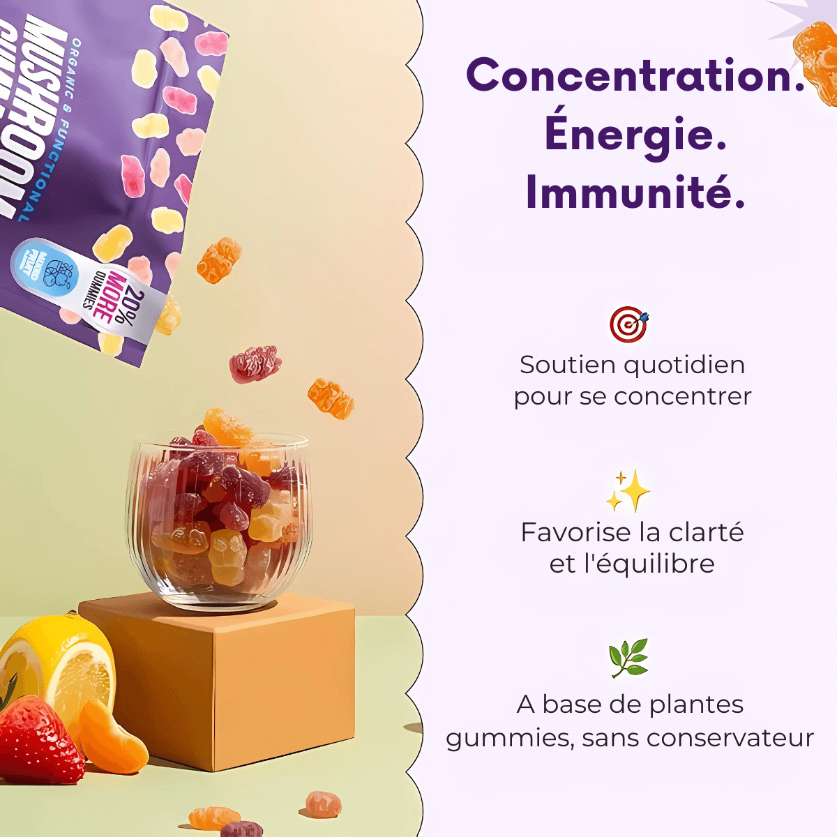 Absolument ! Nos gummies aux champignons sont 100 % véganes, sans OGM et sans additifs artificiels ni agents de remplissage. Ils sont fabriqués avec des ingrédients propres et de haute qualité pour soutenir votre santé naturellement.